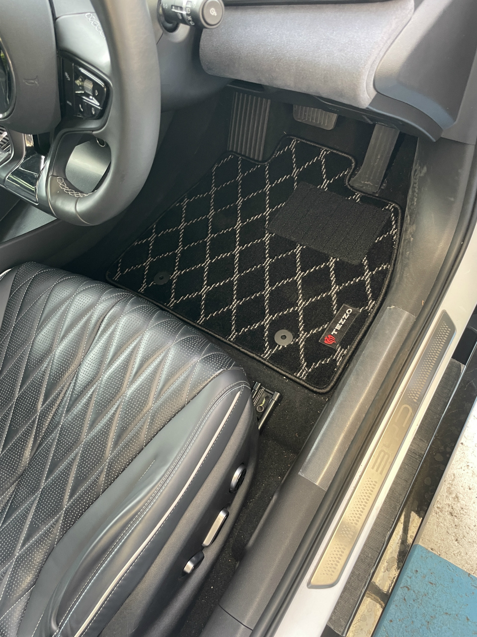 続いてはTEZZOの人気メニュー、フロアマットも前/後席用に開発しました。シックなBYD シールの純正シートが採用するダイヤモンドチェックの表皮デザインに対応したデザインと、実車に合わせて採寸したぴったりなサイズ感をご覧ください。